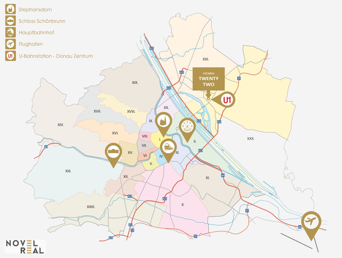 Zur befristeten Vermietung steht eine neuwertige, EXKLUSIVE UND TEILMÖBLIERTE WOHNUNG MIT LOGGIA UND TRAUMHAFTEN FERNBLICK im 20. Stockwerk im neuen und faszinierenden Projekt „Vienna Twentytwo“ gegenüber dem Donau Zentrum und der U-Bahnlinie U1, neben der Vienna International School und nahe der Alten Donau/Donauinsel und dem Vienna International Center (Donau City). Genießen Sie diese