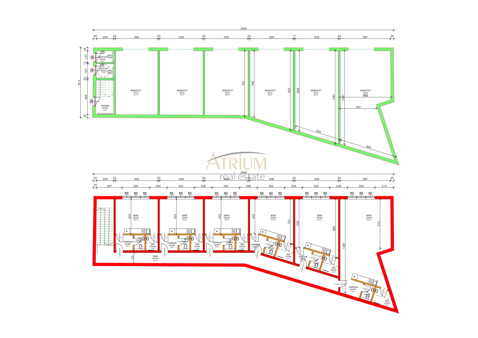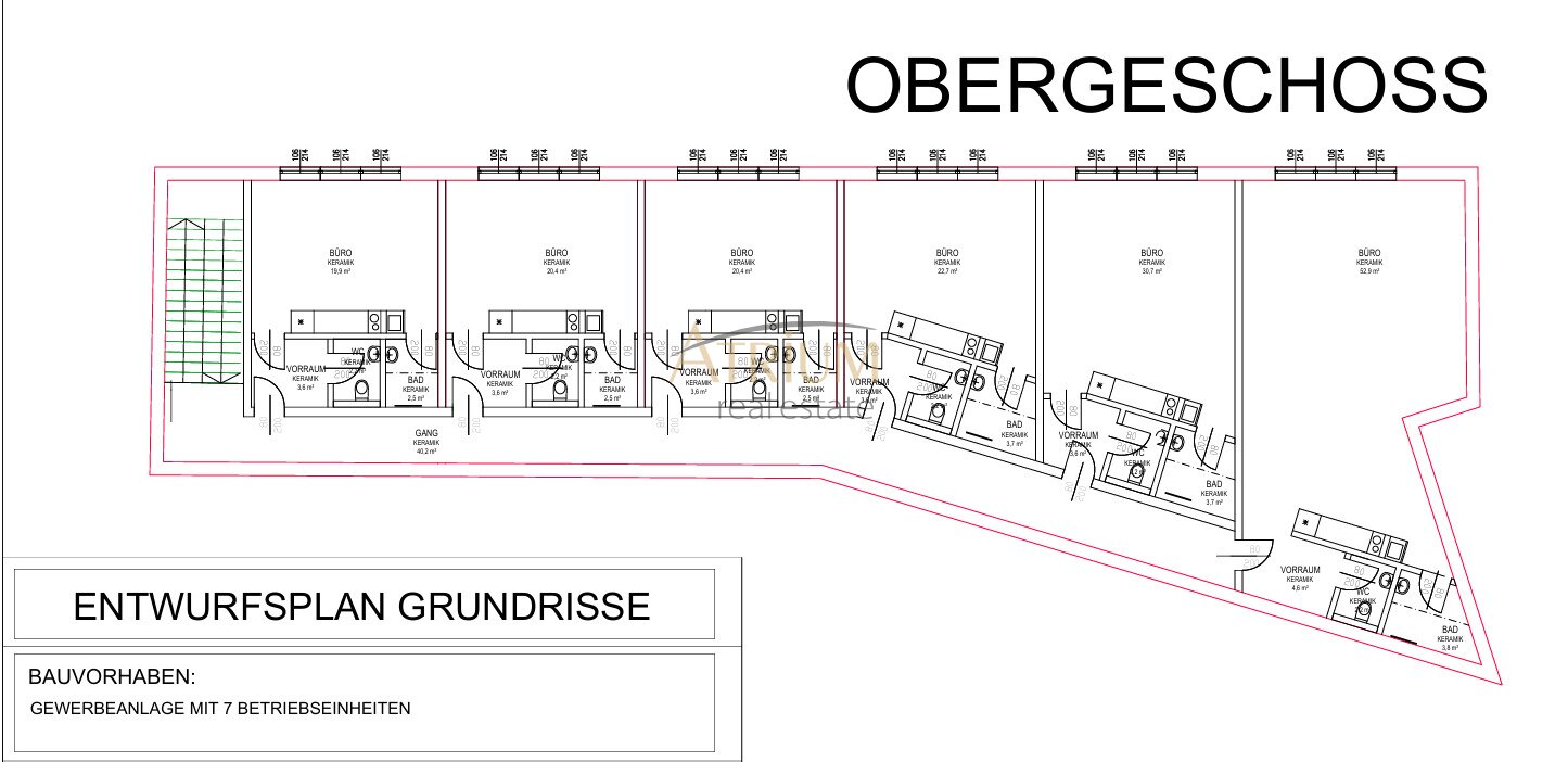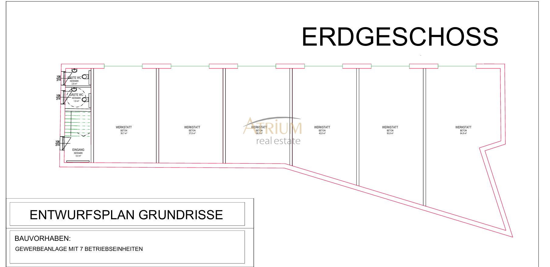 Die ca. 233m² große Gewerbehalle, welche beliebig gestaltet werden kann ist mit elektrischen Einfahrtstoren, Eingangstür, Teeküche und Sanitäreinrichtung ausgestattet. Das moderne Gebäude verfügt über Büros und Hallen mit je sechs Einheiten von ca. 37m² – 65m². Durch die imposante Deckenhöhe von