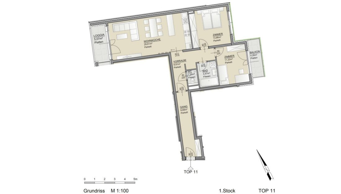 Mit einer großzügigen Fläche von 78,04 m² und drei lichtdurchfluteten Zimmern ist sie perfekt für Paare, kleine Familien oder