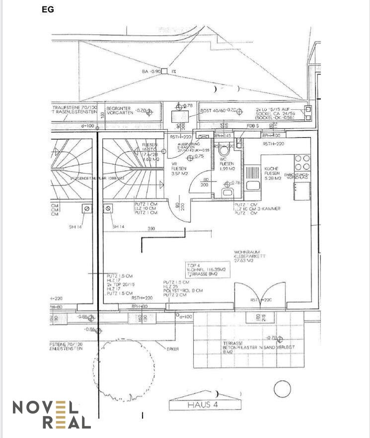 Zur Vermietung gelangt ein Reihenhaus mit 3 Etagen und einer Wohnfläche von 116,35m². Das Haus verfügt über 4 getrennt begehbare Schlafzimmer. Im Erdgeschoss befinden sich der großzügige Wohn-/Essbereich mit direktem Ausgang auf die 8m² große Terrasse sowie eine hochwertige weiße Einbauküche mit eleganter brauner Arbeitsplatte. Weiters gelangt man über den Stiegenaufgang auf die 1. Ebene, in welcher sich