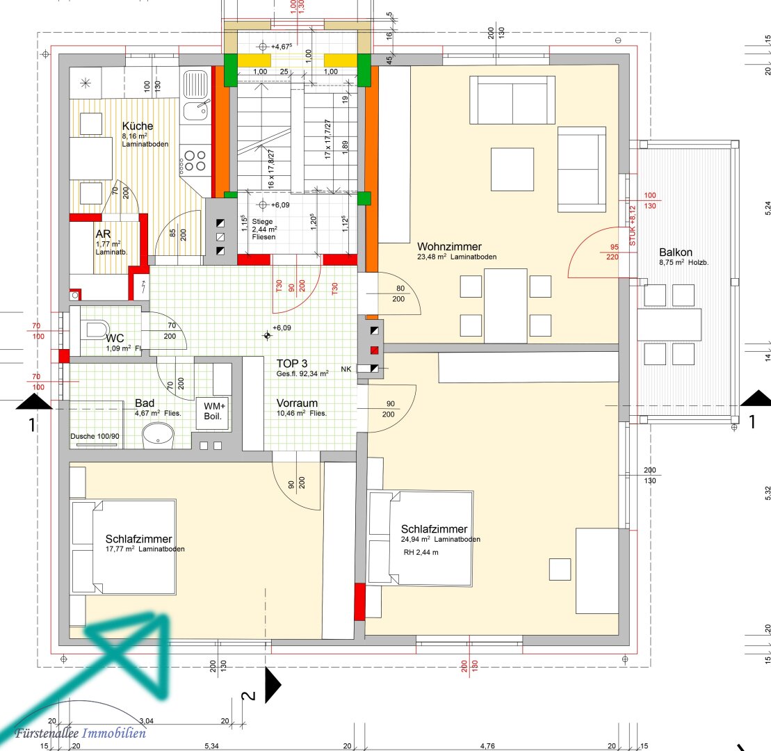 Bestehend aus Vorraum, drei Zimmer, Küche, WC, Badezimmer mit Dusche, Abstellraum, Balkon und Gartenbenützung (Kellerabteil soweit verfügbar).