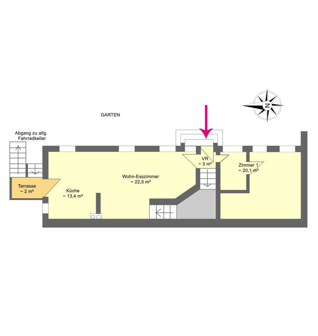 Sehr ruhig gelegen, erfolgt der Zugang über den wunderschönen Garten mit sehr netten Plätzen und Spielbereich, zum exklusiven Hauseingang.