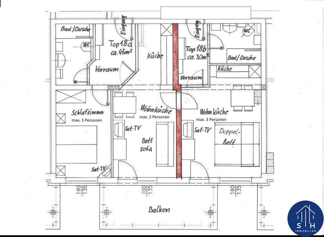 Auf ca. 75 m2 bietet die Wohnung zwei abgetrennte Wohnräume (Tops) mit inkl. 3