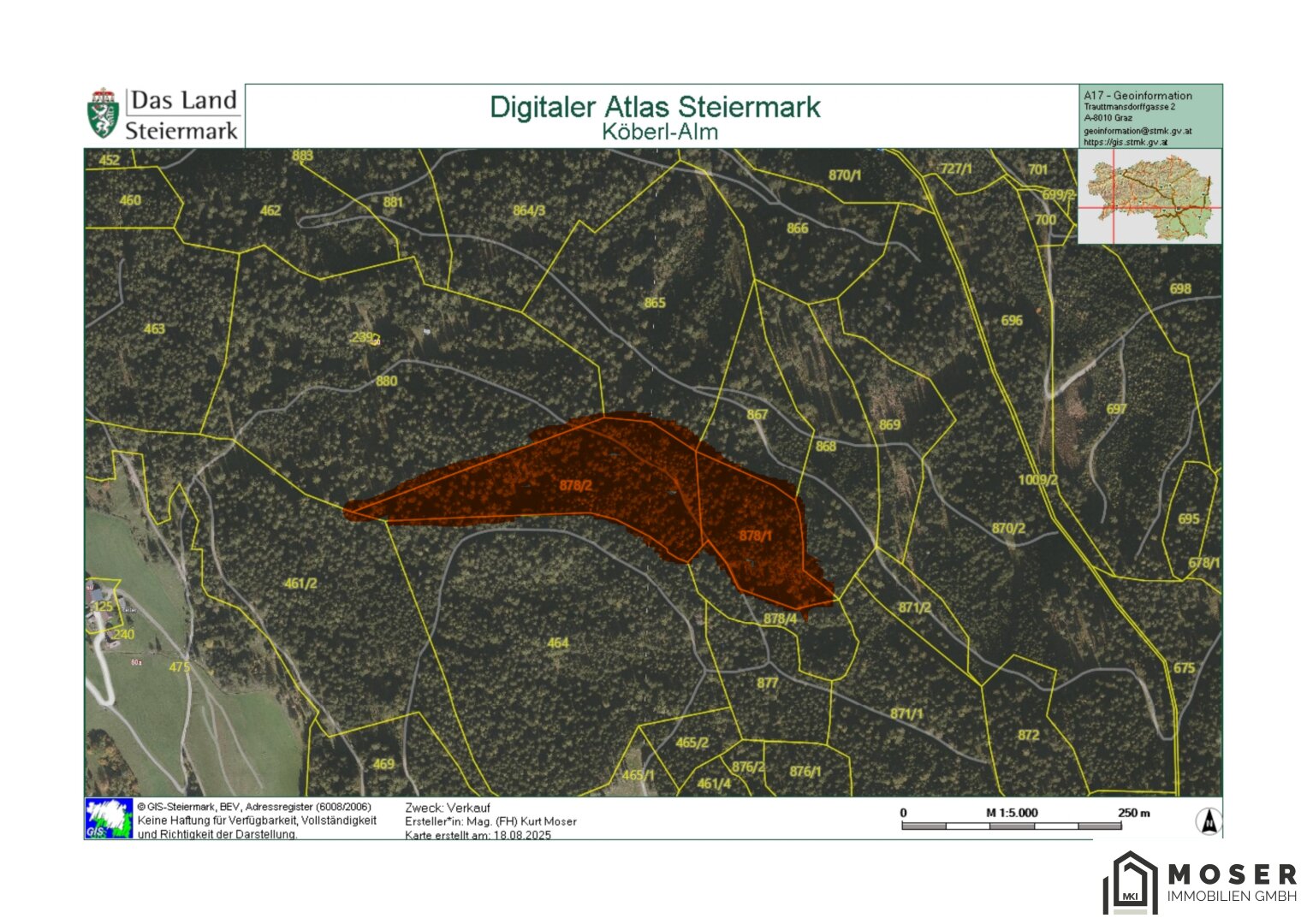 Das östlich gelegene Waldgrundstück selbst liegt auf rund 1230 Meter Seehöhe in ruhiger, gut zugänglicher Lage mit befestigter Zufahrt