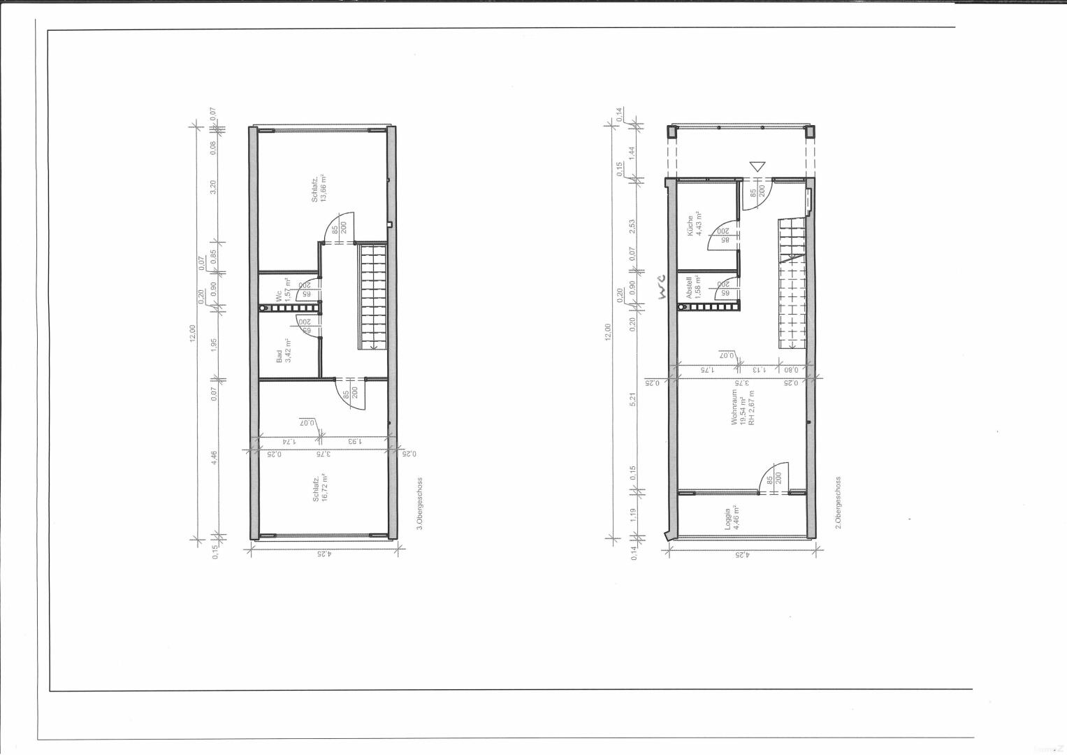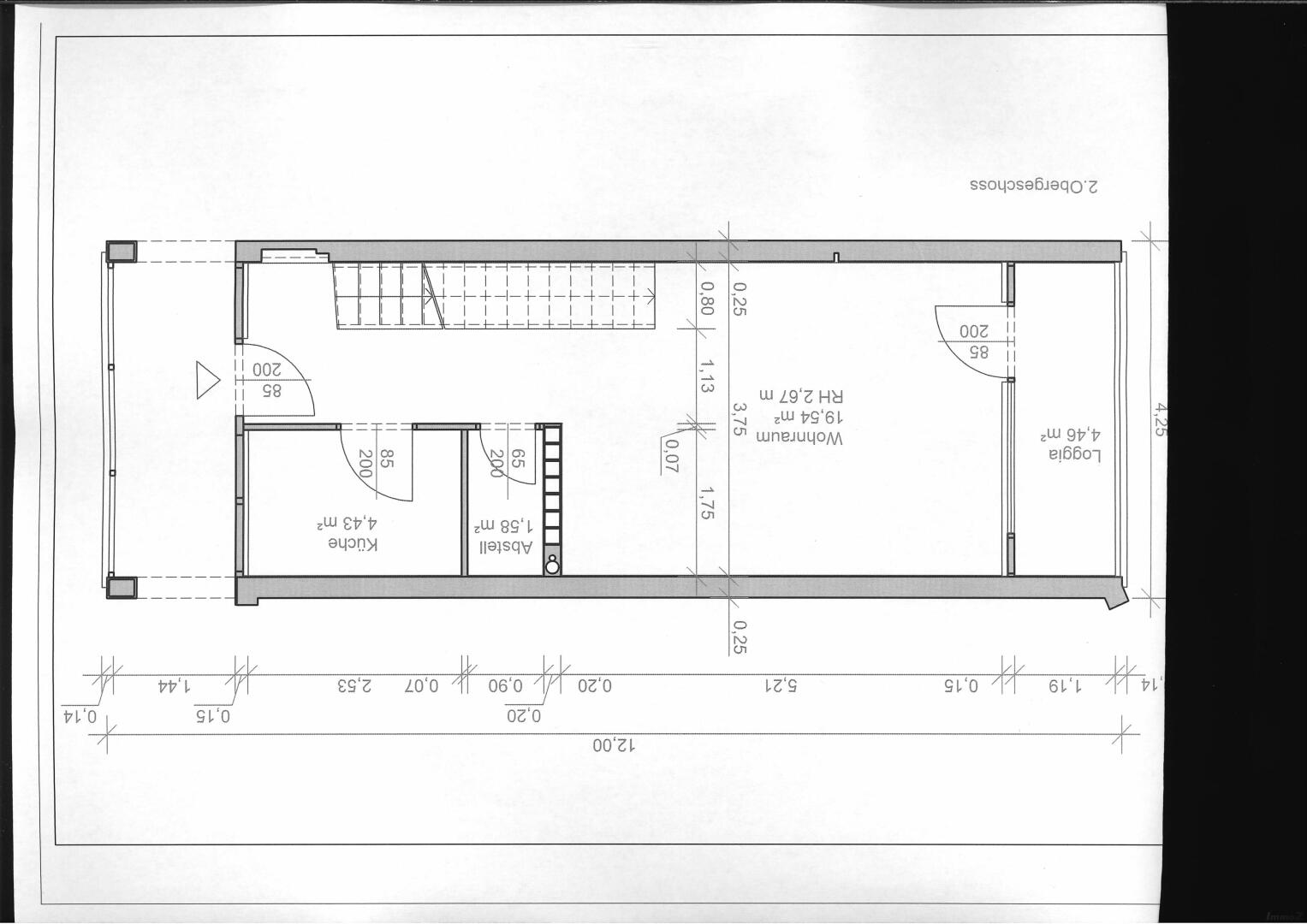 2. OG: Vorraum mit Treppe ins 3.OG, Arbeitsküche mit Fenster, WC mit Waschbecken, Wohnzimmer mit Süd-West-Balkon.