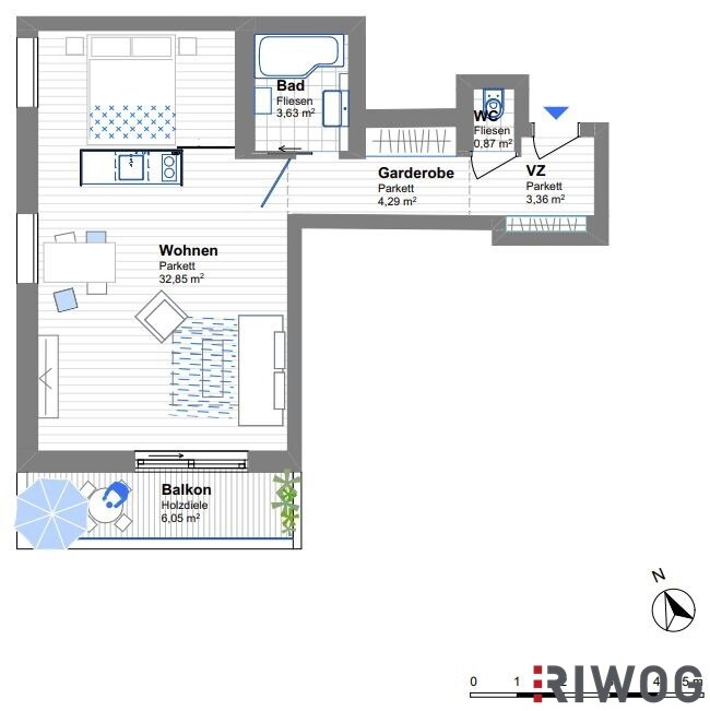 Das Konzept war ein offenes & Luftiges Wohnen weshalb es im Prinzip nur 1 großer Raum ist, der jedoch mit Hilfe der Küche (die als Raumteiler dient) optisch abgetrennt wurde.