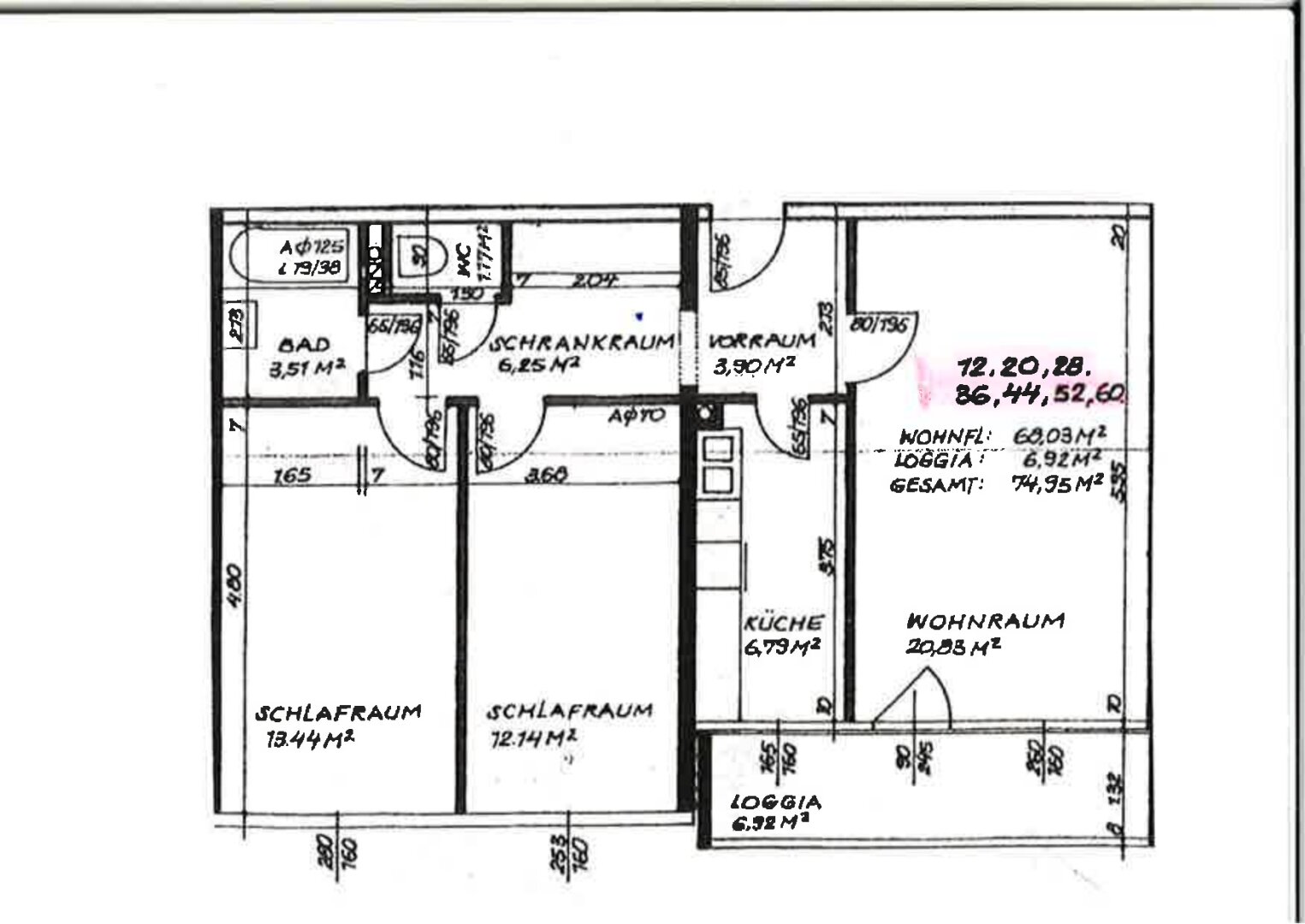 Sie verfügt über 1 geräumiges Wohnzimmer, 2 weitere Räume (jeweils ca. 13m²), eine Küche, ein Badezimmer sowie ein separates WC – alle Räume sind zentral vom Vorzimmer aus begehbar. Eine Loggia (fast