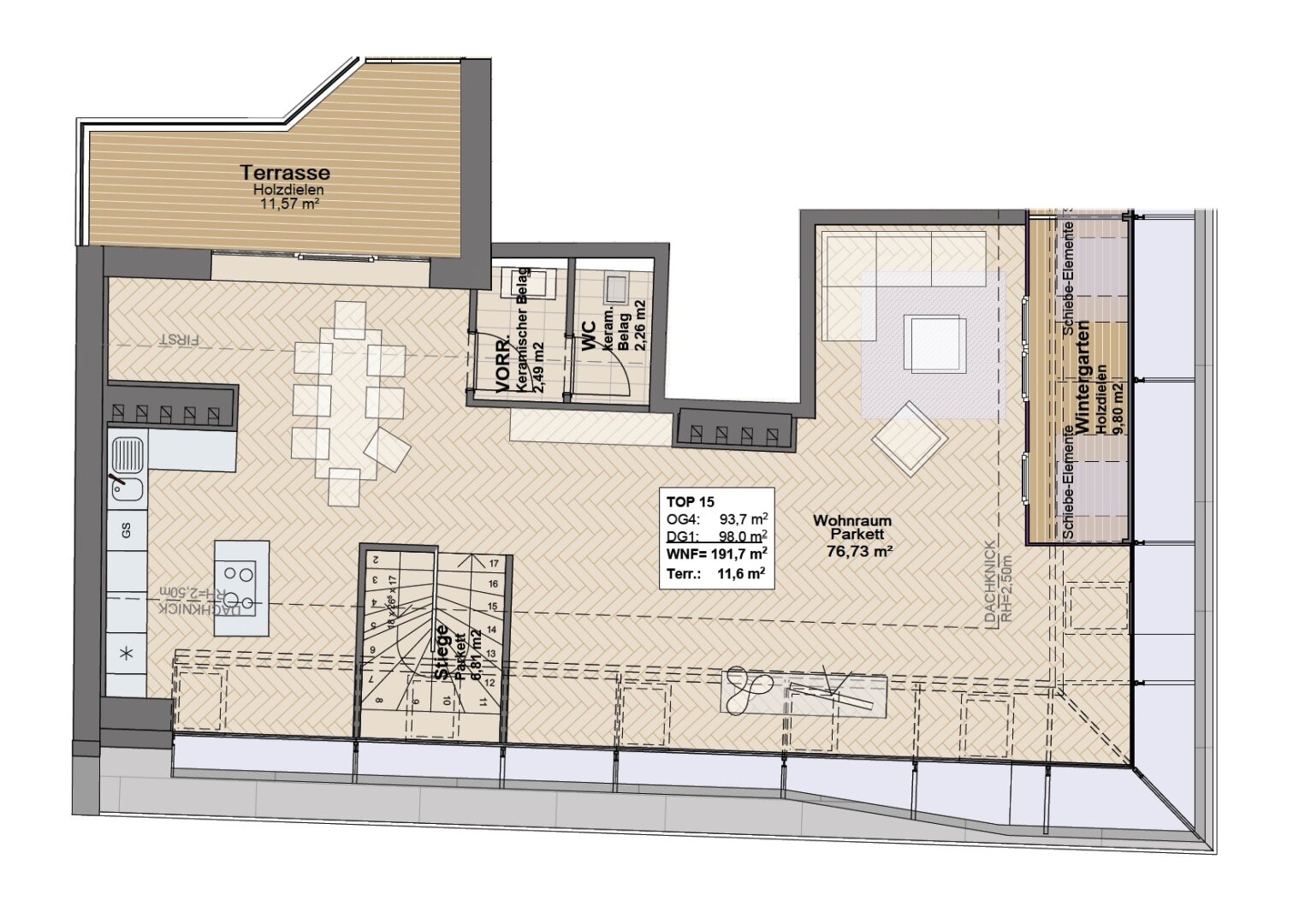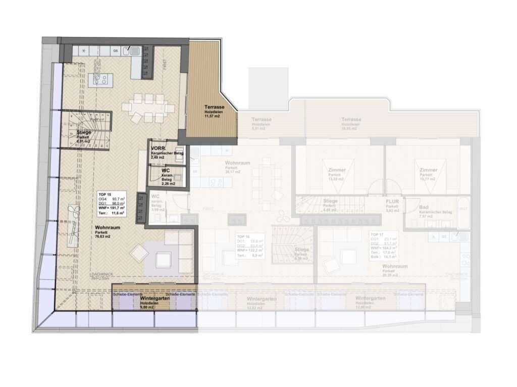 Die Wohnung teilt sich auf eine Wohnebene mit Küche, Terrasse und Wintergarten und eine Schlafebene mit