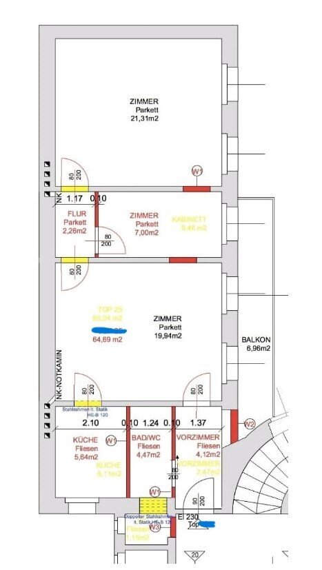 Vorraum, Wohnzimmer/Küche mit Zugang zum Balkon, Schlafzimmer 1, Schlafzimmer 2, Bad mit