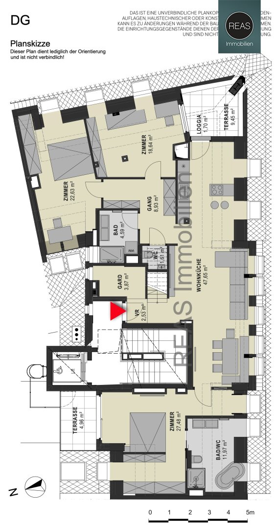 Zum Verkauf gelangt eine luxuriöse Dachgeschoss – Wohnung (klimatisiert) mit 3 Terrassen als Erstbezug nach komplett neuer Errichtung!