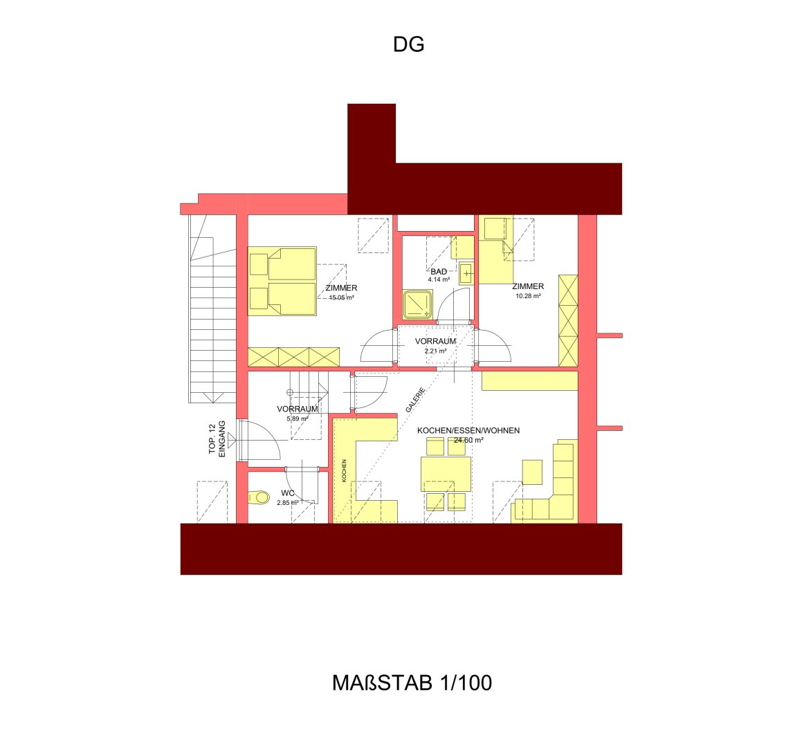 Helle 3-Zimmer-Wohnung im Dachgeschoß (ersten Obergeschoß) eines wunderschönen Altbaugebäudes mit rund 70 m² Wohnfläche und schönem westseitigen Holzbalkon (rd. 4,5 m²). Im Zentrum der  Wohnung mit nach oben offenem Dachstuhl und schönen Holztramdecken befindet sich der geräumige Wohn-Essbereich mit getrennter, komplett ausgestatteter Küche. Vom Vorraum aus gelangt man in zwei