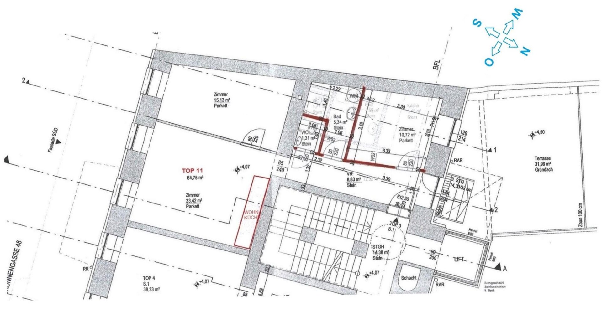 Diese generalsanierte hochwertig sanierte Terrassenwohnung liegt im 1. Liftstock in einem saniertem Altbau. Wohnzimmer südseitig, Terrasse nordwestseitig.