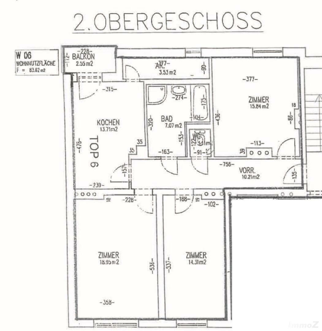 Wohnungsgrößen ca. 83,62 m2. Vorraum, extra WC, großes Bad mit Dusche und Wanne, Küche (extra Raum) mit Zugang zu Balkon und Abstellraum, 3 extra Zimmer.