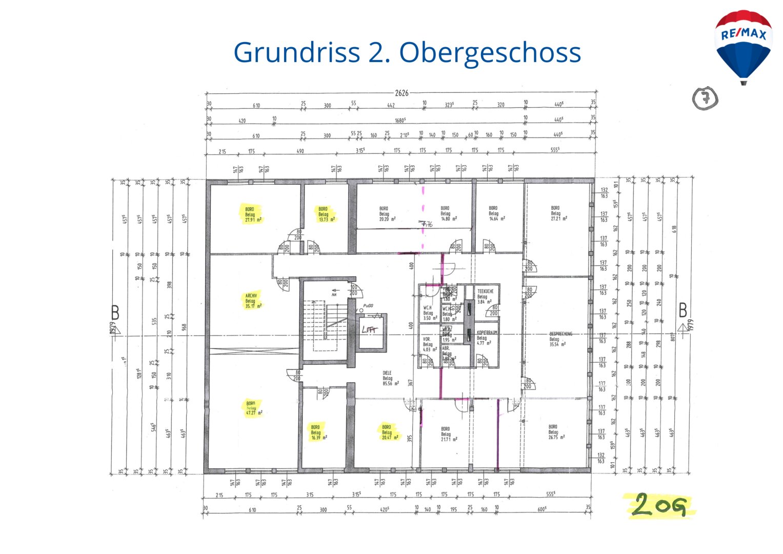 Zweites OG: teilbare 200 m², fünf klimatisierte Büroräume mit Teeküche und WC Und Archiv.