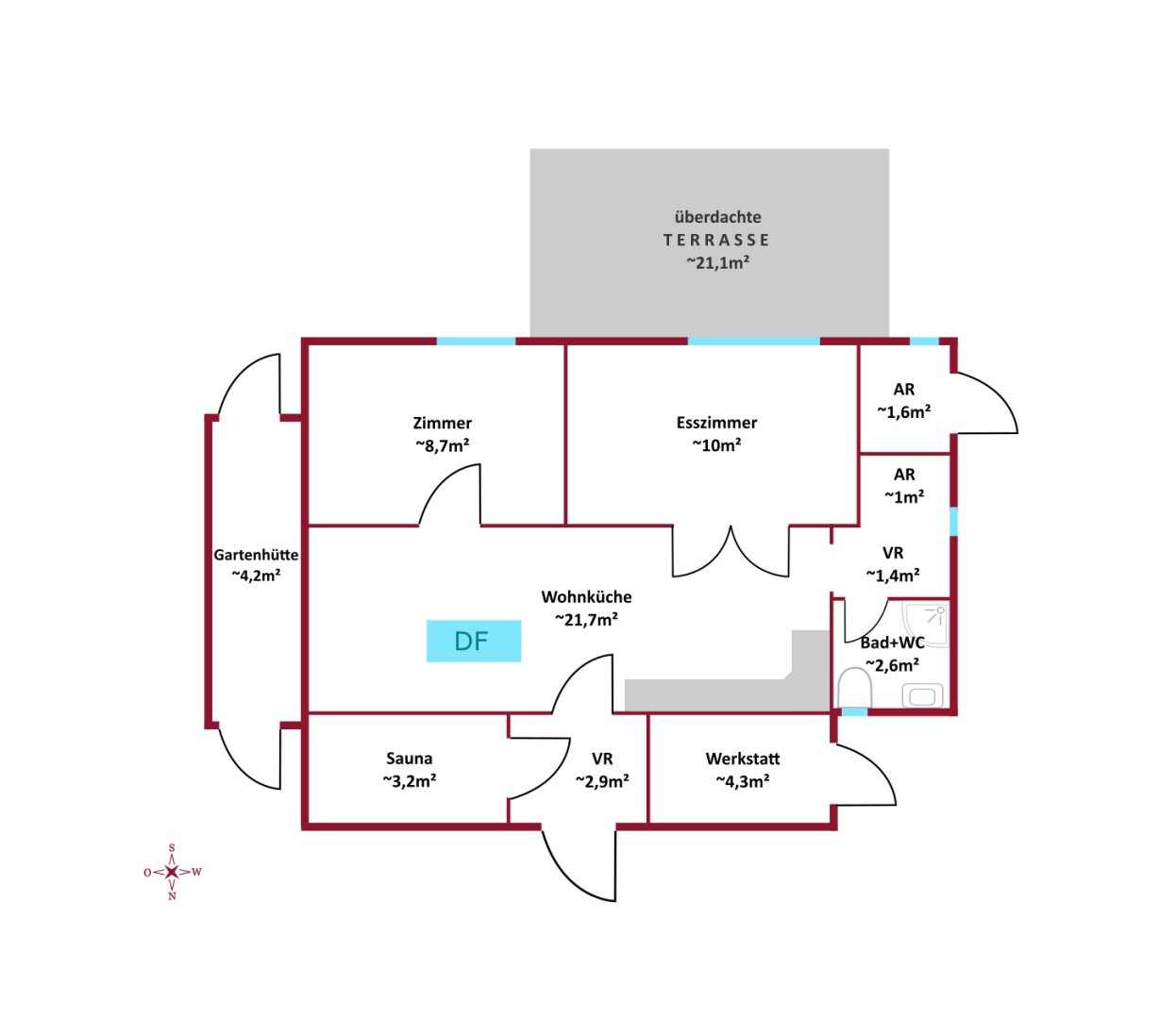 Ebenfalls zum Haus gehören jeweils von außen begehbar, eine Werkstatt und ein 4m² großer Abstellraum.
