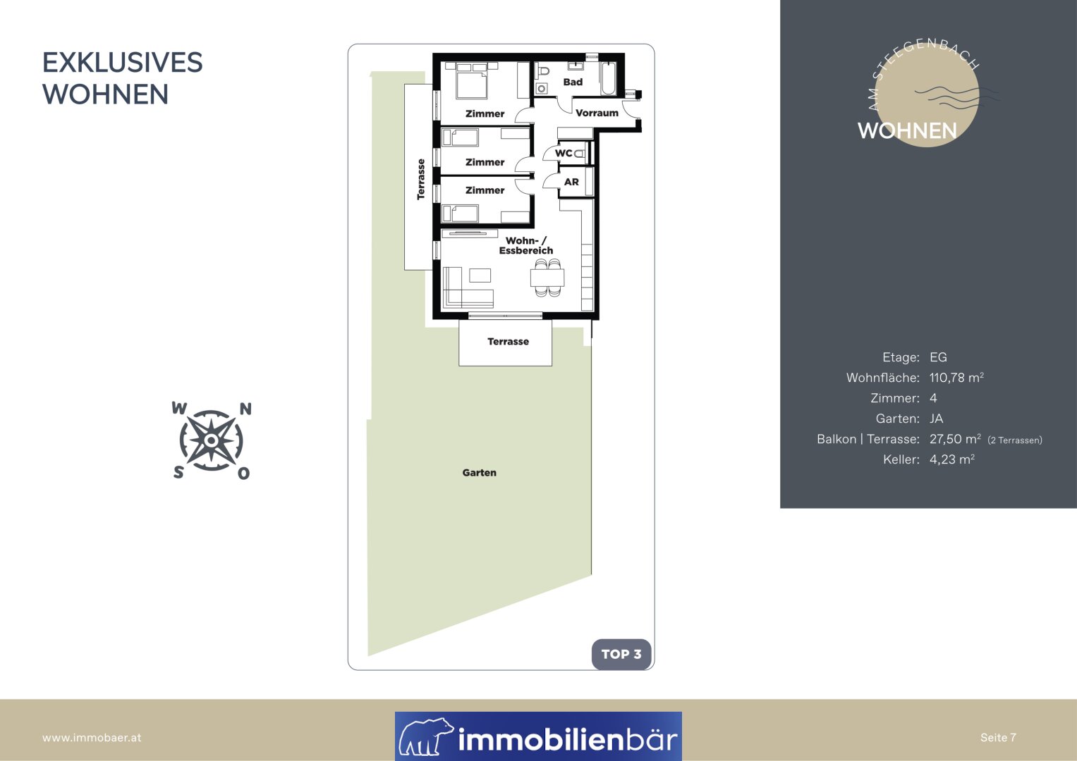 Exklusives Wohnen am Steegenbach – hochwertig ausgestattete 4 Zimmer Gartenwohnung – 2 Parkplätze – inkl. Küche – Top 3