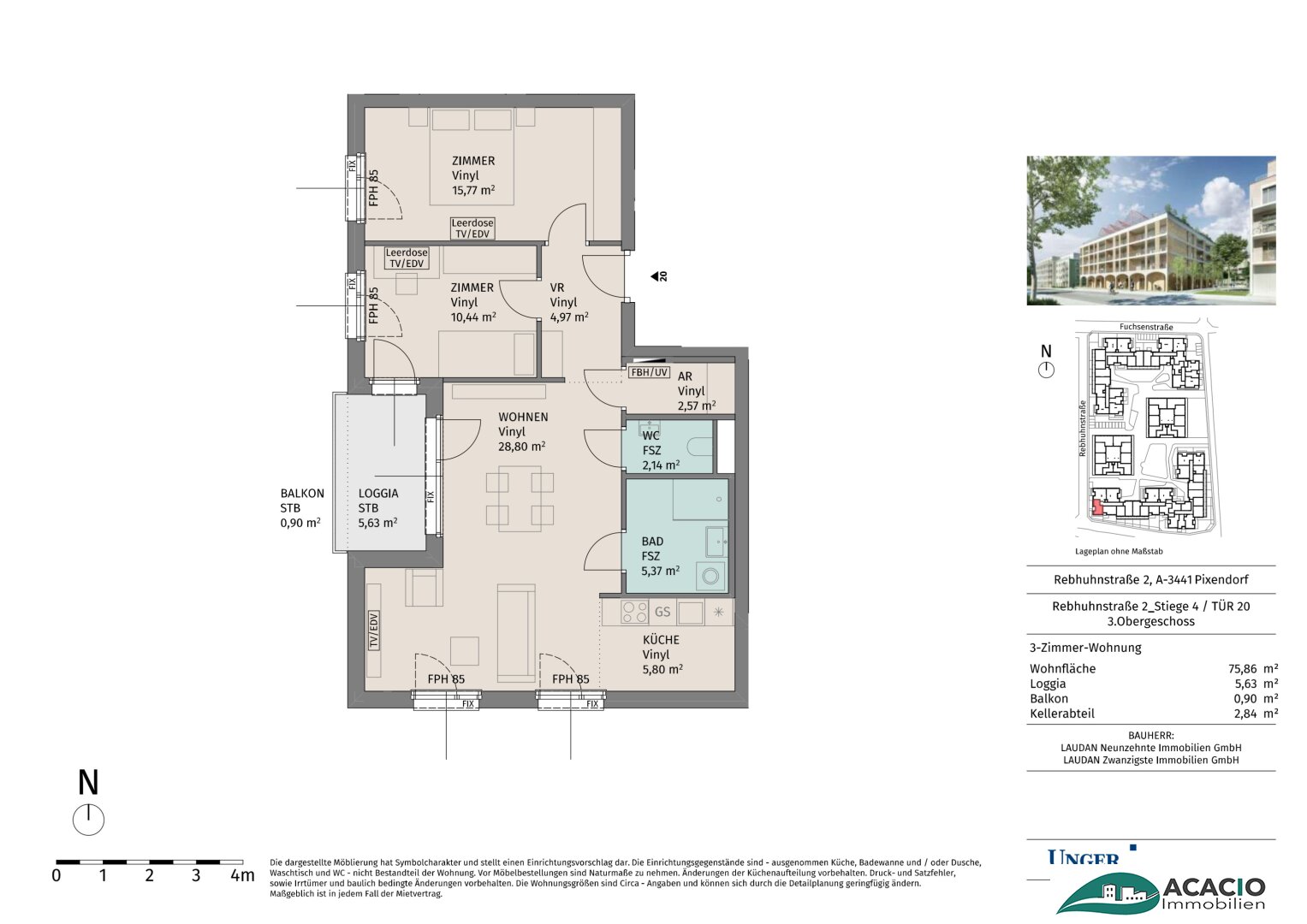 Diese topmoderne Neubau-Mietwohnung im 3. Liftgeschoß verfügt über ca. 75,86m² Wohnfläche. Genießen Sie die Abendsonne auf Ihrer Loggia.