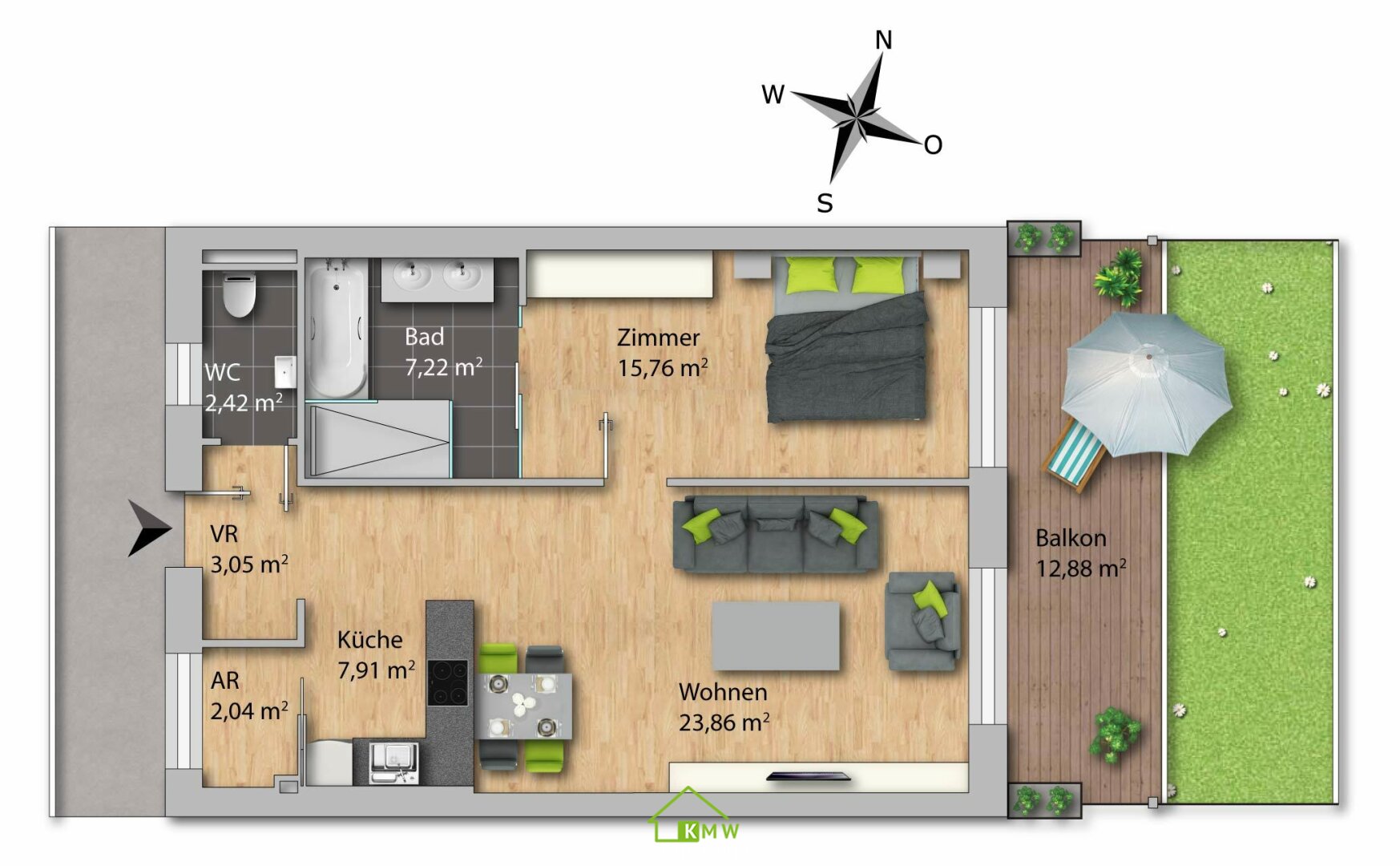 Die Wohnfläche von rund 62m² verteilt sich auf Vorraum, Abstellraum, Schlafzimmer mit integriertem Bad, separates WC, großzügige Wohnküche und Wohnzimmer mit Ausgang auf den Balkon.