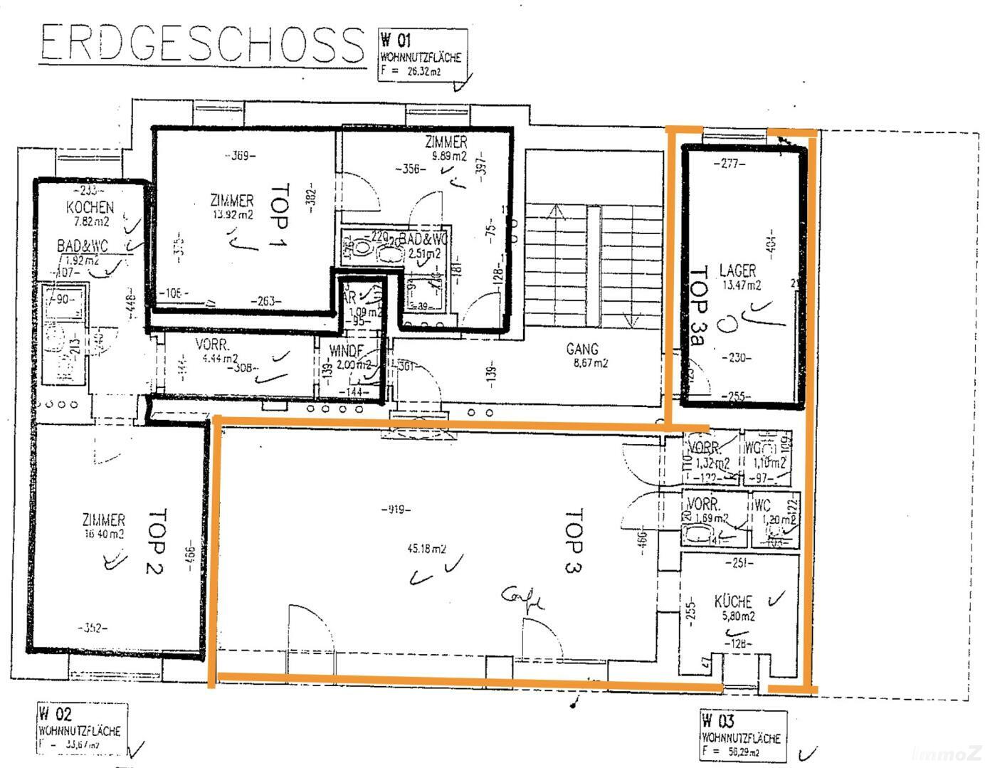 Im Erdgeschoss mit eigenem Zugang direkt von der Straße (öffentliche Parkplätze mit Grüner Zone) betritt man einen ca. 45 m2 großen Raum. Eine Küche sowie getrennte WC-Anlagen stehen zur Verfügung. Weiters gibt es über das Stiegenhaus noch einen 13,47 m2 großen Lagerraum.