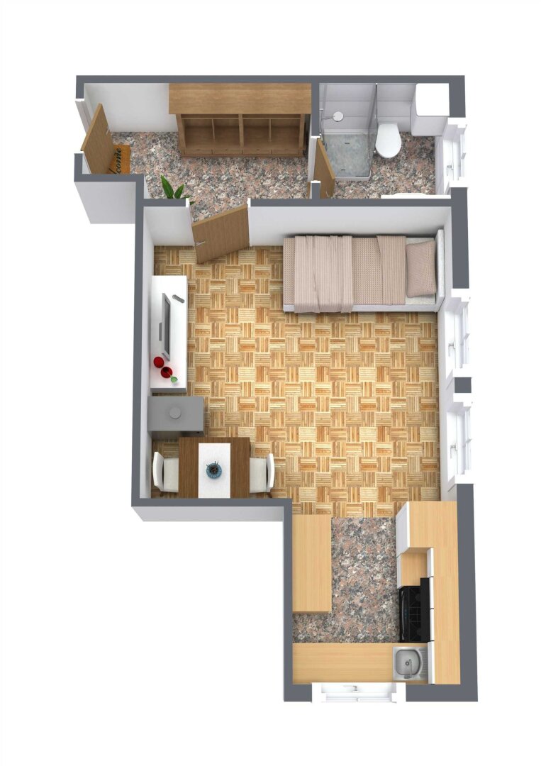 Die gegenständliche Wohnung befindet sich im Erdgeschoss eines kleinen und feinen Mehrparteienhauses (nur 5 Wohnungen) und verfügt über ein großzügiges Wohn-/Schlafzimmer mit offener Küche, welches durch drei Fenster mit sehr viel Tageslicht versorgt wird. Beheizt wird die Wohnung mit einer Elektrofußbodenheizung und einem charmanten Holzofen. Die Küche ist mit Backofen, Dunstabzug