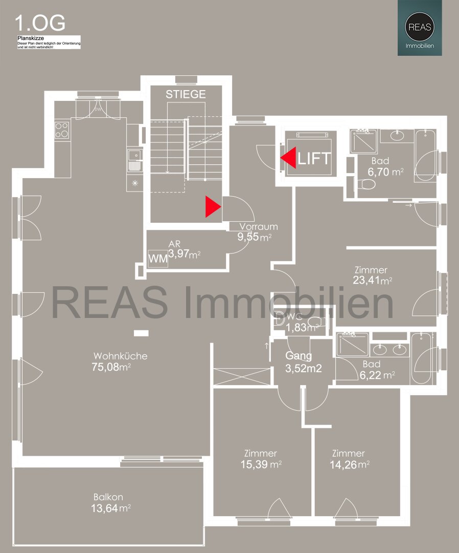 Raumaufteilung im 1. Obergeschoss (mit direktem Lift-Zugang):
