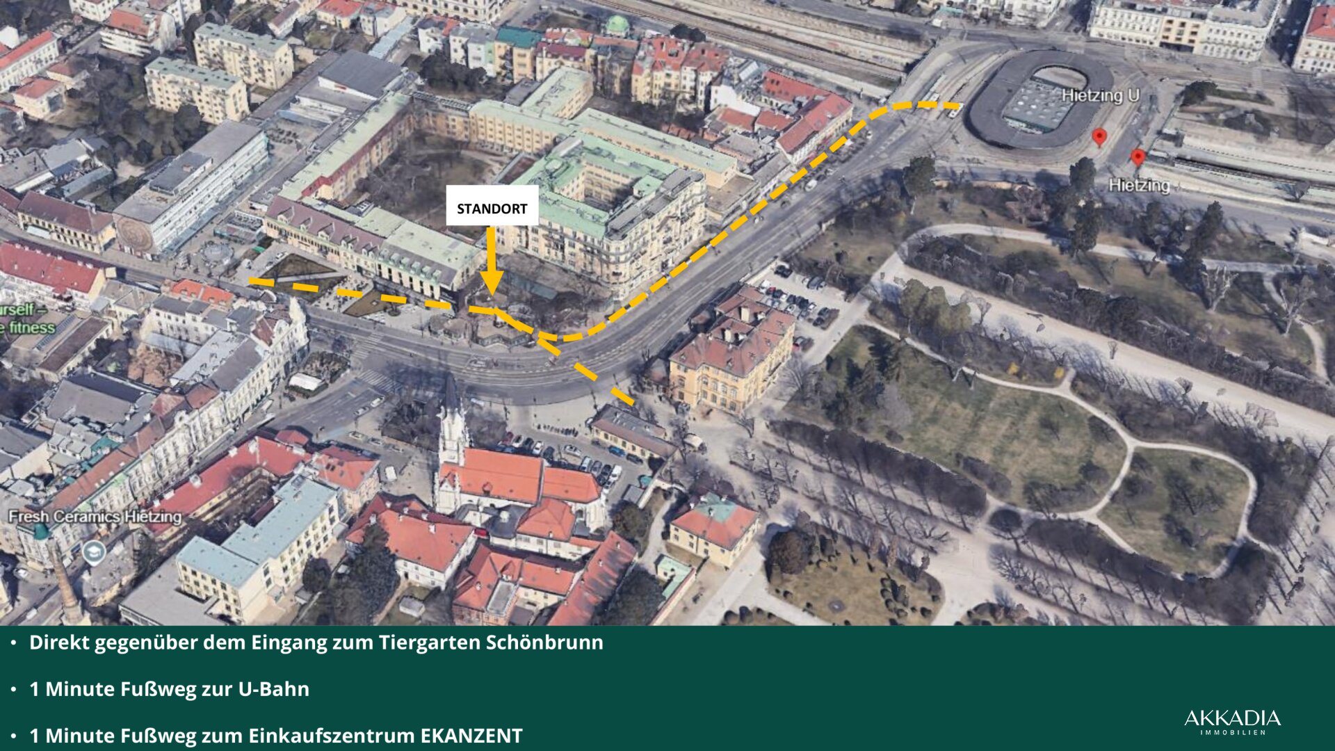 Das Mietobjekt befindet sich in einer hervorragenden Lage: direkt gegenüber dem Schloss Schönbrunn und in unmittelbarer Nähe zum Tiergarten Schönbrunn. Es profitiert von einer täglich hohen Besucherfrequenz — sowohl durch Touristen als auch durch Besucher des Einkaufszentrums EKAZENT. Die rund 70 m² große Fläche eignet sich ideal für ein Geschäft