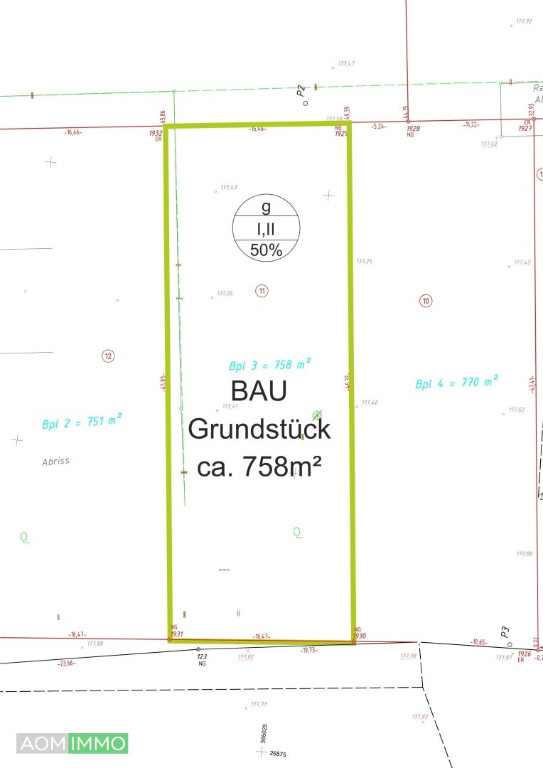 ist durch seine Form interessant zu gestalten. Die Gesamtfläche des Grundstückes hat ca. 758m²und hat eine Breite von ca. +/-16,5m und Länge von ca. +/- 46m. Die Grundstücke werden auf bauland Wohngebiet umgewidmet, mit der Bauklasse I und II