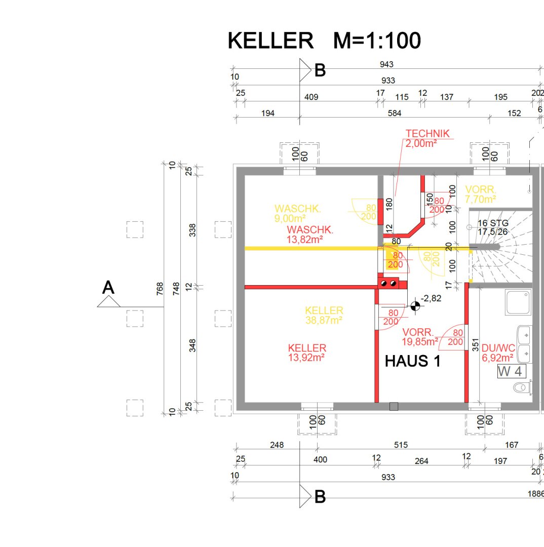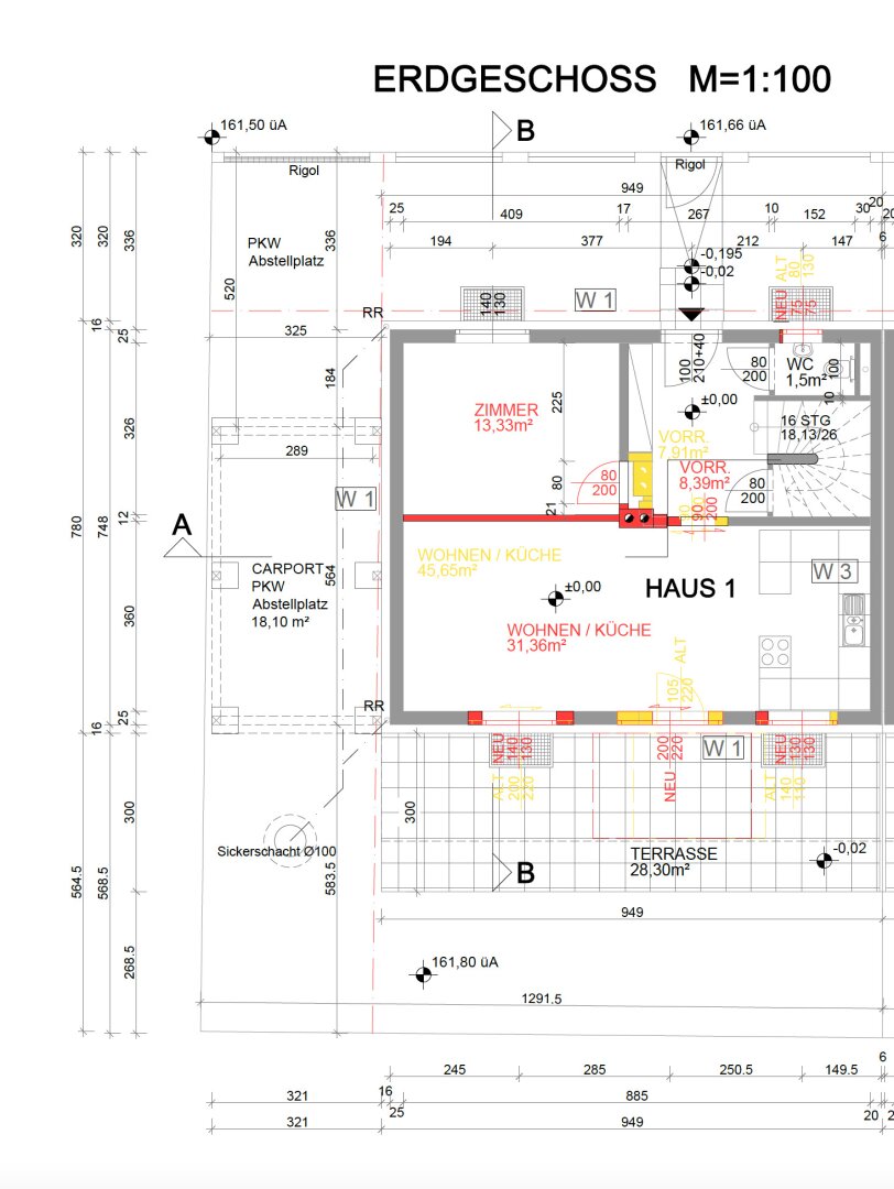 Erdgeschoss: Vorraum, WC, Zimmer (13,33 m²), Wohnküche (31,36) mit Zugang auf die Terrasse (28,30 m²) und den Garten (ca. 139,47 m²). Die Wohnküche könnte mit einem Durchbruch auf
