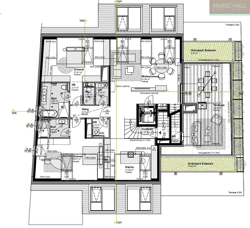 Das ca. 166 m² große Penthouse mit direktem Liftausstieg verfügt über einen schönen Wohnbereich mit angrenzender Küche und bietet Zugang zu der großzügigen vorgelagerten Süd-Ost-Terrasse. Über eine wohnungsinterne Treppe