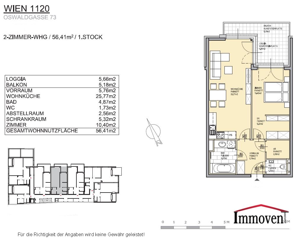 Die Wohnung befindet sich im 1. Obergeschoss (mit Lift), bietet eine Wohnfläche von ca. 56 m² und eine große Loggia/Balkon.