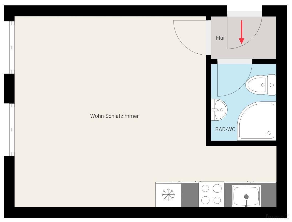 Die Wohnung besticht durch ihre praktische Aufteilung mit einem Zimmer, einer Einbauküche und einem Badezimmer mit einer Dusche und einem WC mit Häcksler.