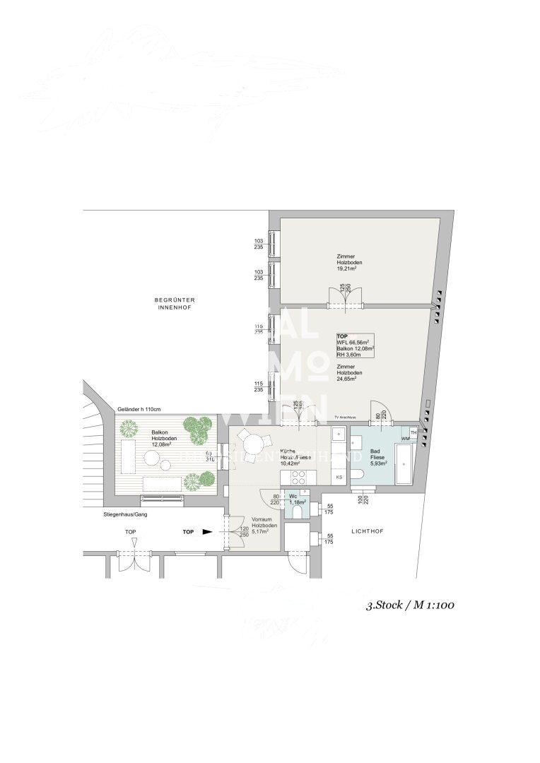 Die Wohnung befindet sich in der 3. Etage und bietet eine Fläche von 66,56m². Sie verfügt über 2 Zimmer, 2