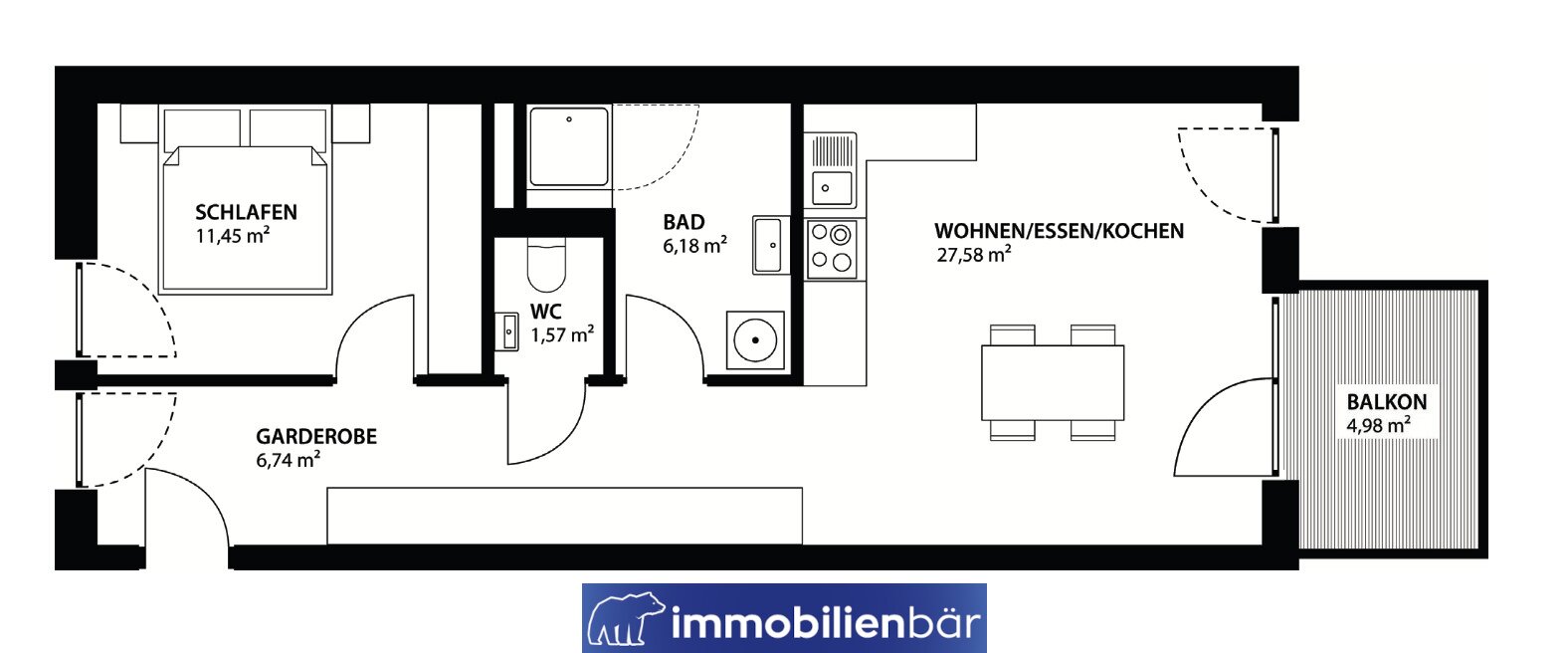 Die Wohnung Top 2 liegt im 1. Obergeschoss und überzeugt durch ihren durchdachten Grundriss: Auf rund 53,52 m² Wohnfläche erwarten Sie ein heller Wohn-/Essbereich mit integrierter Küche, ein Schlafzimmer,