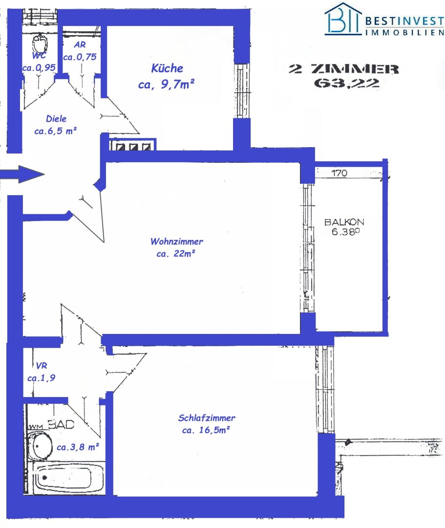 Diese gemütliche 2,5 Zimmer Wohnung ist sehr geräumig geschnitten und bietet viel Wohnfläche. Die Diele hat Platz für Ihre Garderobe und Schuhe. Eine voll ausgestattet, neuwertige Küche inspiriert Hobby Köche und hat noch Platz für einen Essbereich. Das großzügige Wohnzimmer hat einen direkten Zugang auf die Loggia, wo man gemütlich