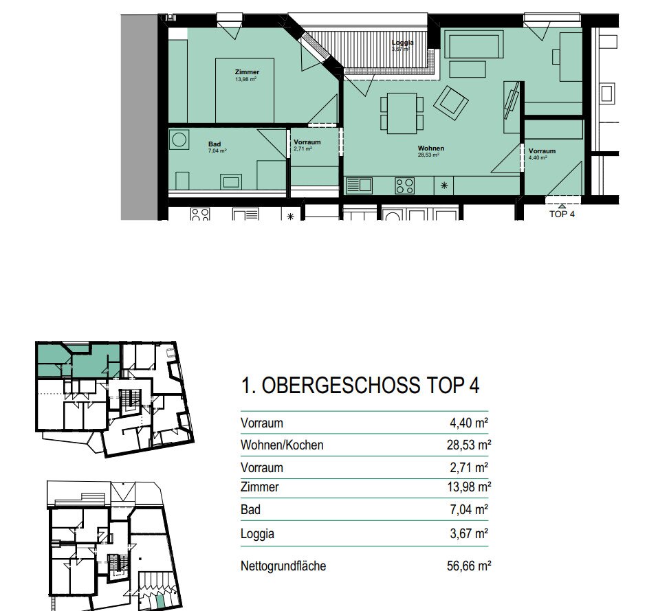 Die neuwertige Wohnung verfügt über ca. 56,66 m² und teilt sich we folgt auf: