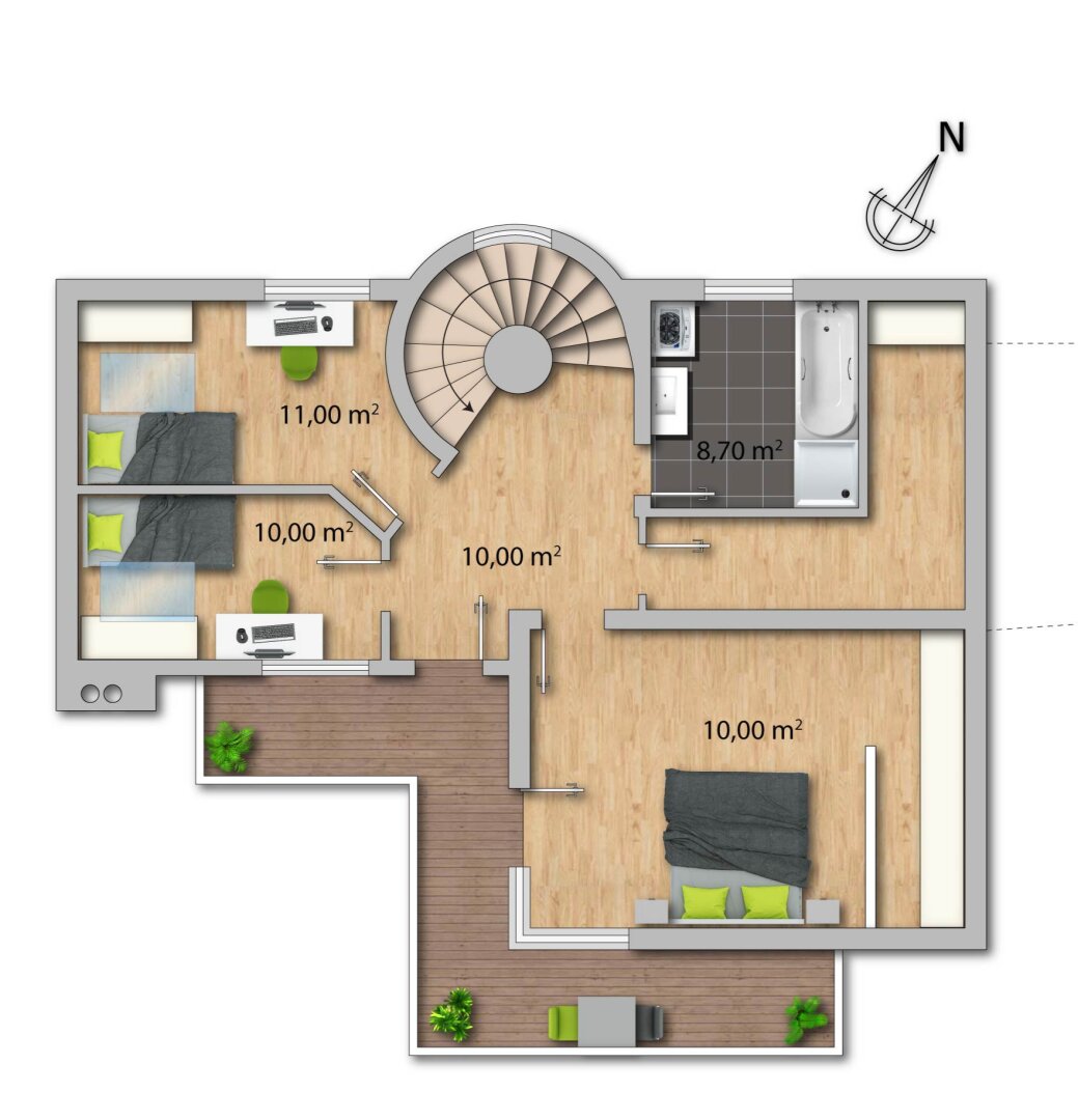 Jedes Haus verfügt über eine großzügige Wohnfläche, sonnige Terrasse, gepflegten Garten, Keller, Garagen und mehrere Stellplätze.