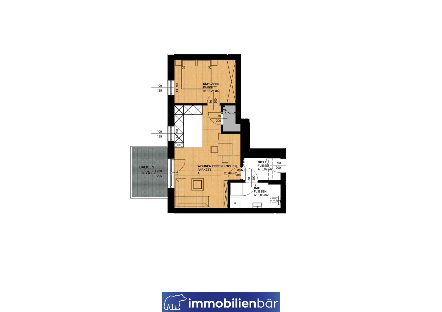 Vorraum, Schlafzimmer, Bad mit Dusche und WC, Wohn-, Ess-, Küchenbereich mit