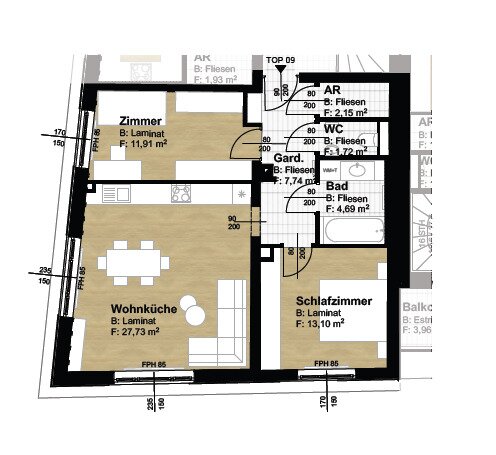 Die Wohnung besteht aus einer Wohnküche, zwei Schlafzimmern, Bad, WC und Abstellraum.