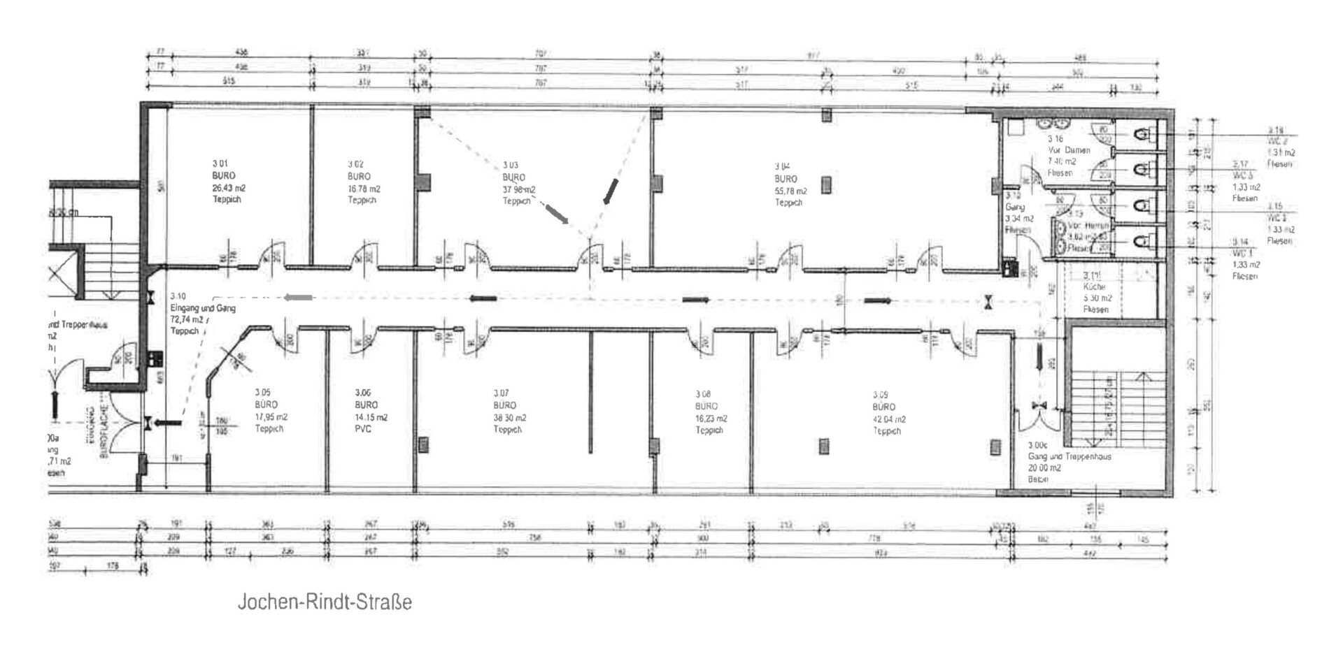 Das Büro mit ca. 372m² Nutzfläche im 3. OG besteht aus 9 Büros, eine Kochnische und Damen/Herren WC.