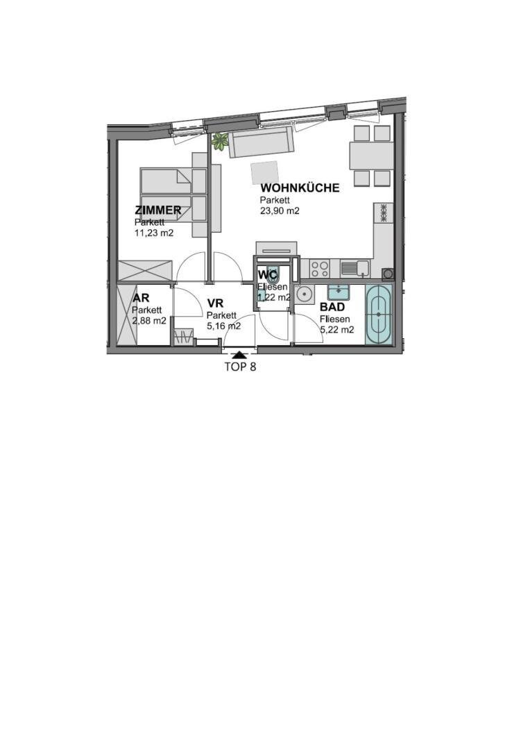 Raumaufteilung: Vorraum, Wohnküche, Schlafzimmer, Badezimmer, WC, Abstellraum