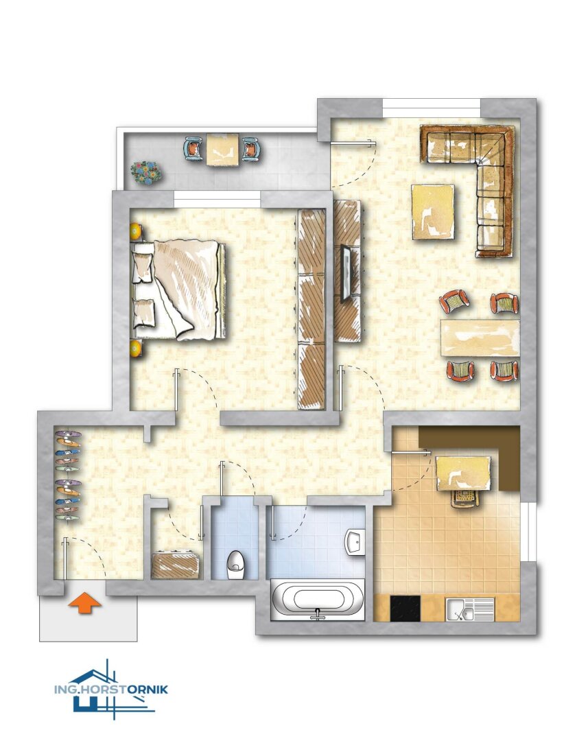 Diese schöne und geräumige Wohnung befindet sich im 7. Obergeschoß und ist mittels Aufzug bequem erreichbar und bietet einen herrlichen Ausblick auf Graz und Umgebung. Alle Zimmer sind zentral begehbar. Das Wohnzimmer ist westseitig gelegen mit Zugang