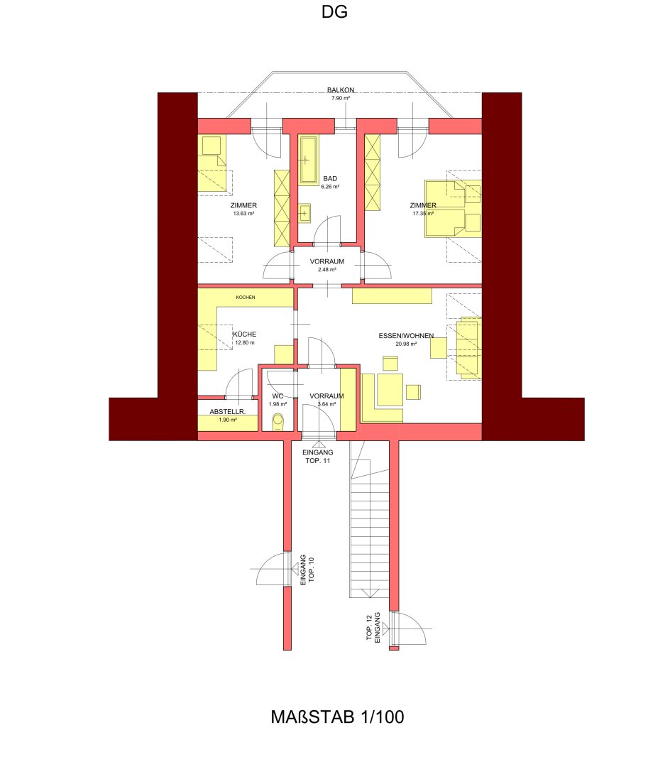 Wunderschöne 3-Zimmer-Wohnung im Dachgeschoß (erstes Obergeschoß ohne Lift) eines schönen Altbaugebäudes mit riesigem, ostseitigen Holzbalkon (rd. 7,9 m²). Im Zentrum der Wohnung mit nach oben offenem Dachstuhl und schönen Holztramdecken befindet sich der geräumige Wohn-Essbereich mit getrennter, komplett ausgestatteter Küche und eigener Speis. Von zwei großen Zimmern aus, die links