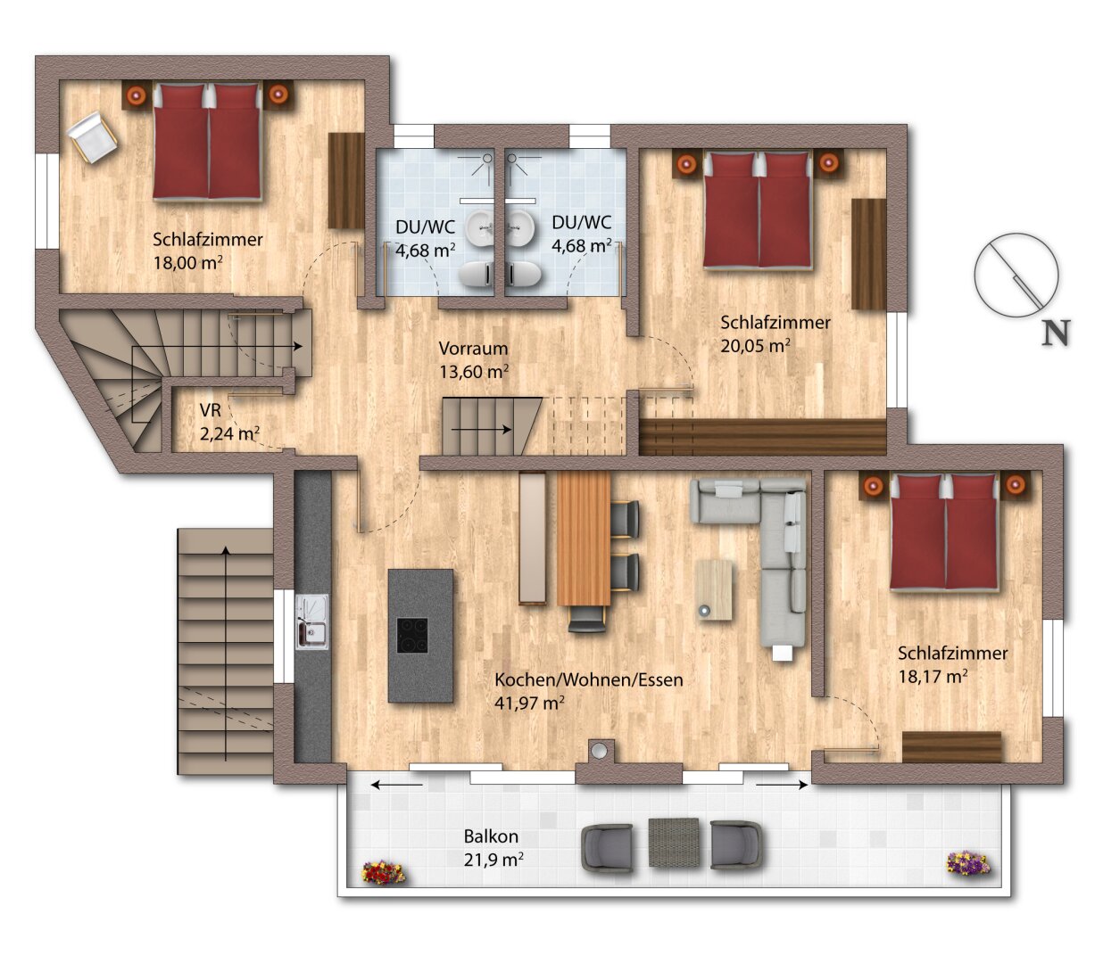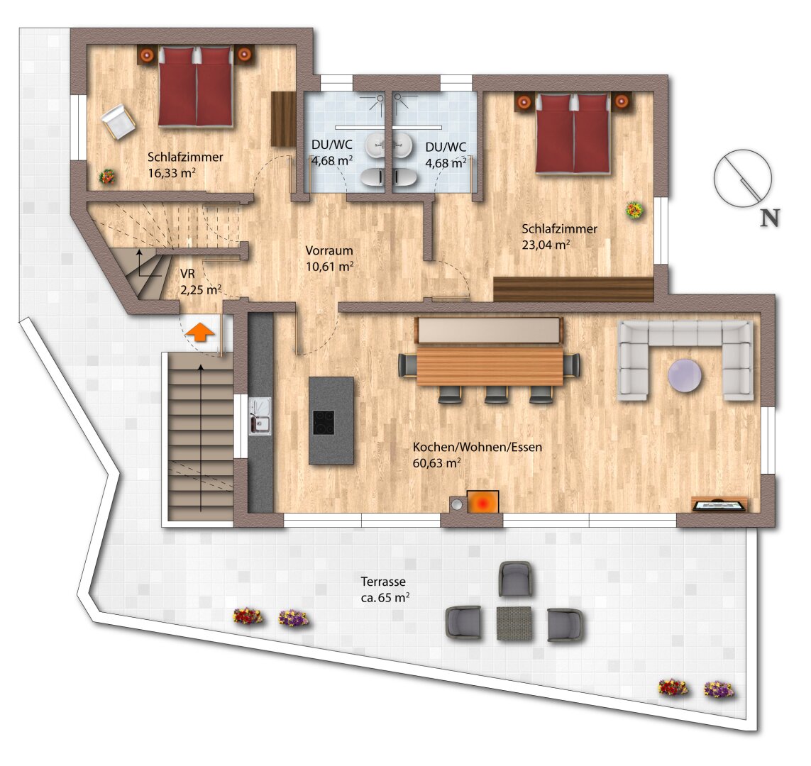 Das Erdgeschoss beherbergt das Herzstück des Hauses, eine Wohnung mit einem beeindruckenden Wohnraum von