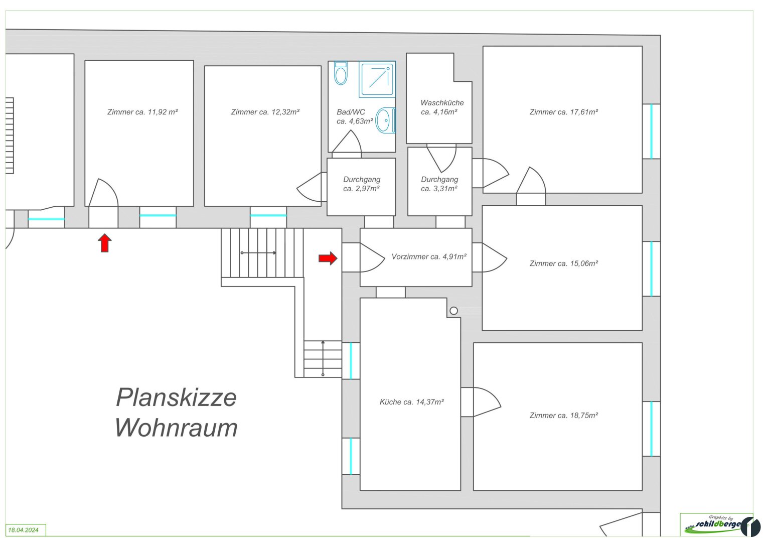 Auf dem gesamt ca. 807 m² großen Grundstück (Widmung Bauland Agrar) befindet sich das Wohngebäude mit ca. 110 m² Wohnfläche und die Nebengebäude mit ca. 274m².