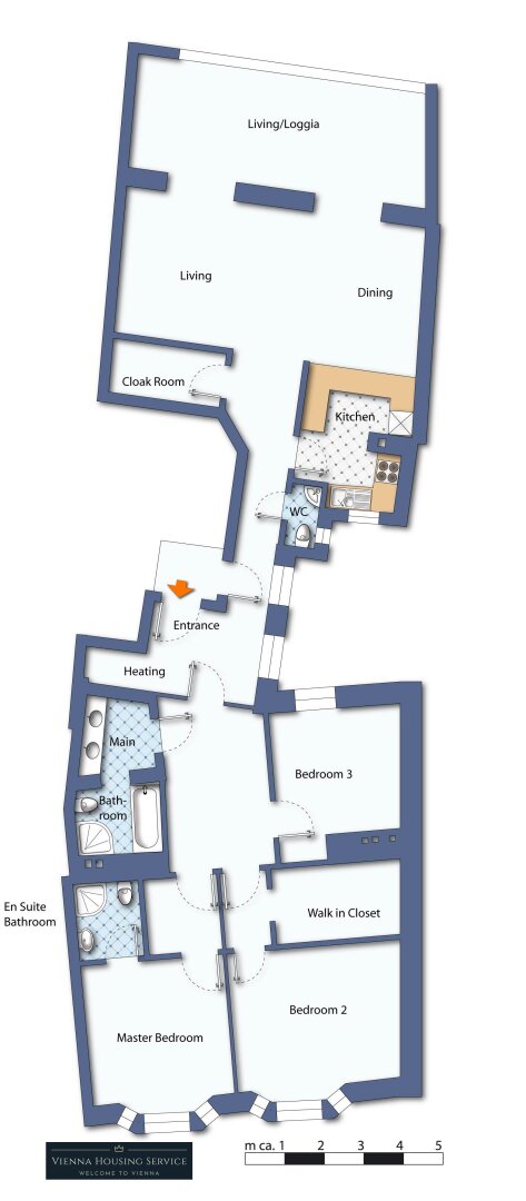 This bright and fully renovated apartment offers a generous living room, three bedrooms, two bathrooms, and a practical layout with all rooms centrally accessible — ideal for comfortable city living.