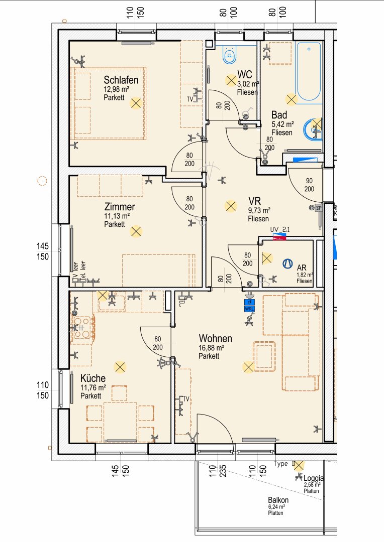 Beim Betreten der Wohnung empfängt Sie ein großzügiger Vorraum, der ausreichend Platz für eine Garderobe bietet. Von hier aus sind das Wohnzimmer, 2 Schlafzimmer, das