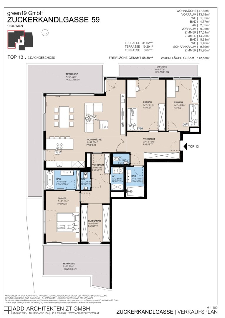 Die exklusive 143 m² große Wohnung verfügt über 58 m² Freiflächen und bietet eine großzügige Wohnküche, drei Schlafzimmer, zwei Bäder (eines davon im Elternschlafzimmer), zwei WCs ( beide separat), einen Schrankraum, zwei Vorräume sowie einen Abstellraum. Sowohl von der Wohnküche als auch von allen Schlafzimmern gibt es einen direkten Zugang auf