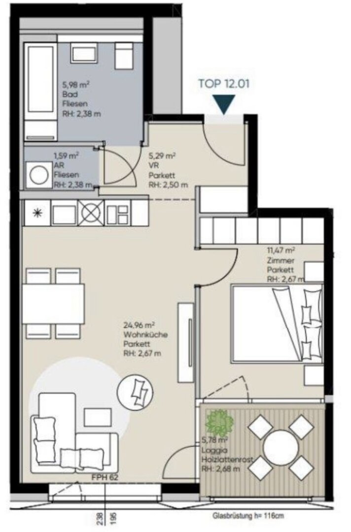 Top 112 befindet sich im 12. Obergeschoss und schenkt luftige, helle Räumlichkeiten. Vom Vorraum aus hat man direkten Zugang zum Bad, zum Abstellraum sowie zur Wohnküche. Der Wohnraum verfügt über eine moderne Einbauküche und einen Ausgang zur Loggia, auf der sich