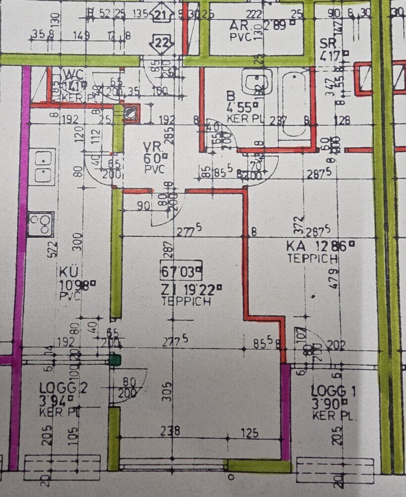 bestehend aus Vorraum, WC, Küche mit Zugang zum Wohnzimmer, Bad mit Waschmaschinenanschluss, Wohnzimmer mit Ausgang auf die Loggia, Schlafzimmer mit Ausgang auf die Loggia
