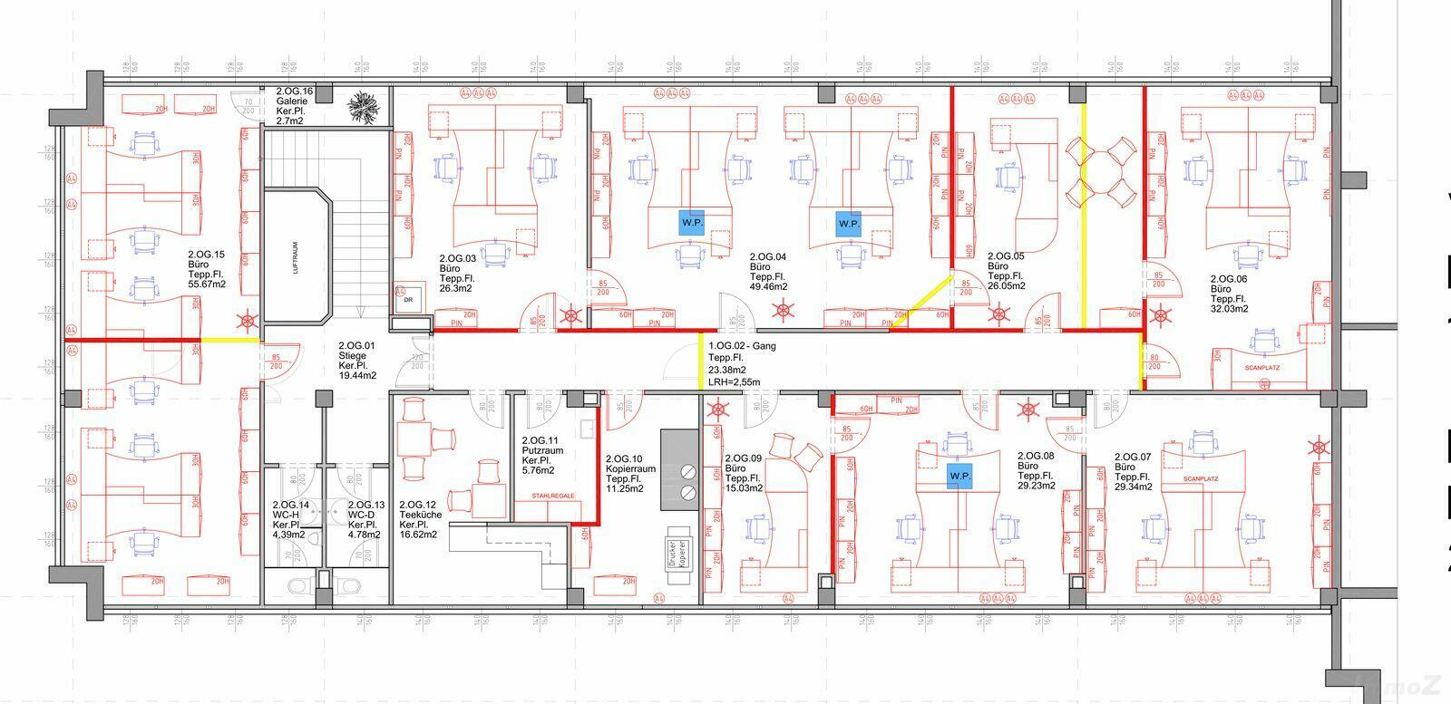 Fläche im 2.OG: 331 m². Eine Teilung – Etagenweise oder in Kleinbüros ist möglich. Pro Etage befinden sich 2 Sanitärbereiche, sowie eine Küche mit Aufenthaltsraum. Die Büroräume sind unmöbliert, jedoch mit Beleuchtung ausgestattet. In den Betriebskosten sind die Stromkosten inkludiert. Parkplätze können um Euro 82,-netto /Monat angemietet werden. Eine Halle